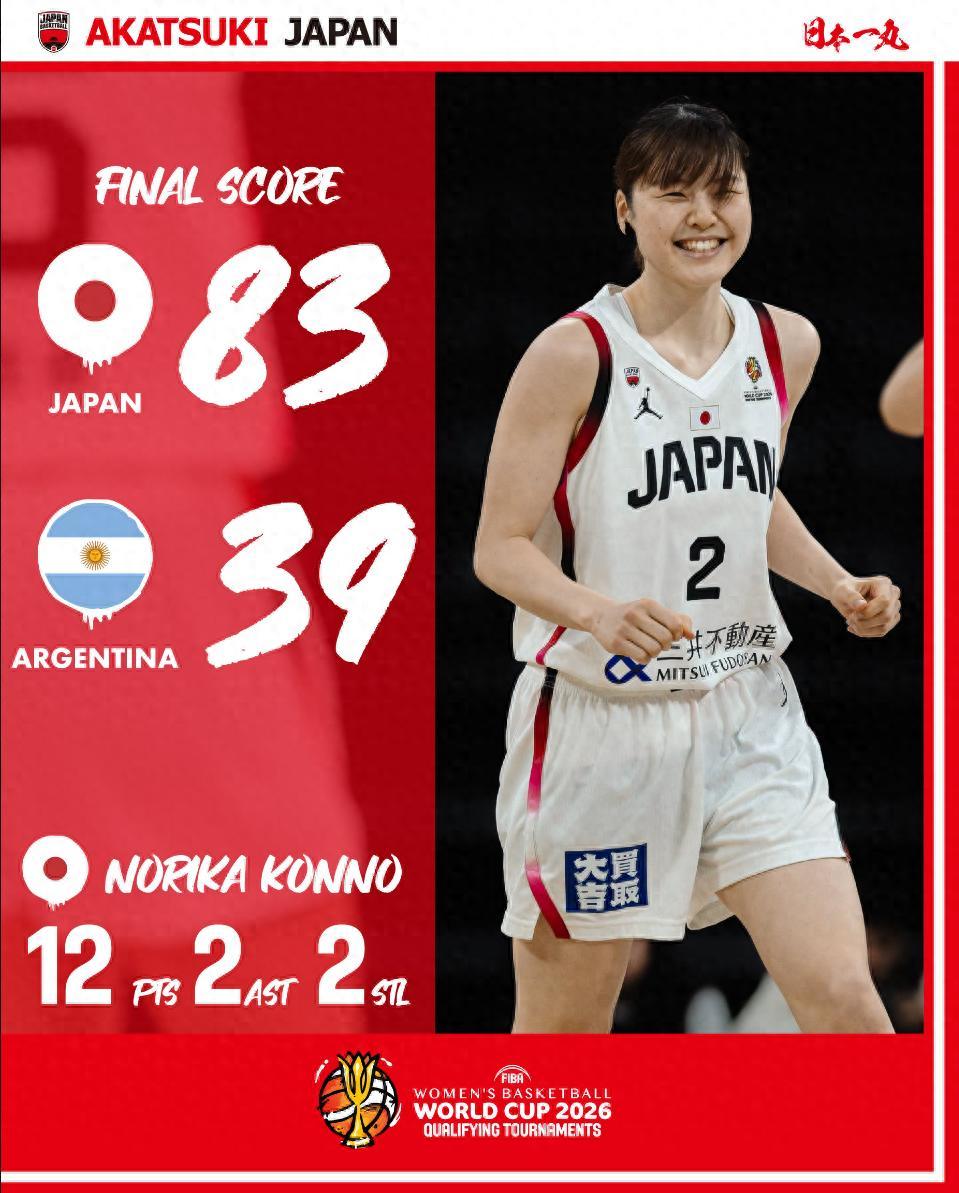 面對實力孱弱的阿根廷,日本隊首節23-7直接一波流帶走比賽,最終更是狂勝44分。平下愛佳17分5籃板2助攻,今野紀花12分2籃板,山本麻衣10分助攻4籃板,東騰奈奈子9分2籃板,渡嘉敷來夢8分2籃板,斯蒂芬妮8分。