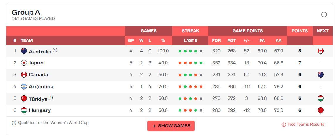 雖然日本隊拿到了一場44分的大勝,他們也將負的淨勝分改寫爲+18,但她們只贏了加拿大與阿根廷而已,他們與匈牙利、土耳其、澳大利亞的交手都是失利,所以日本隊要拿到世界盃門票還需要同時滿足兩個條件!