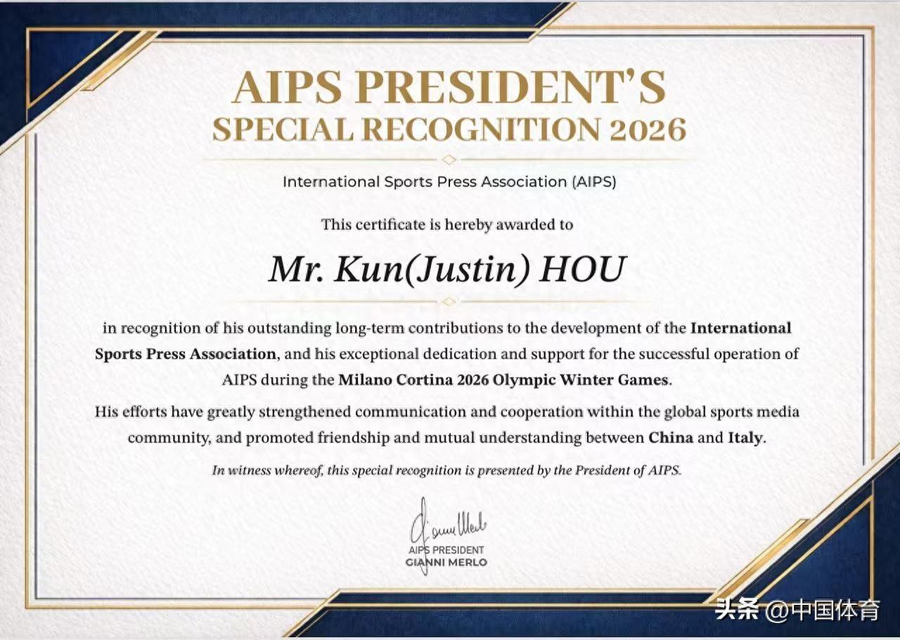 中國體育訊 國際體育記者協會(AIPS)近日向奧林匹克文化推廣人、國際奧委會文化與奧林匹克遺產委員會委員侯琨先生頒發2026年度AIPS主席特別表彰,以表彰其對協會發展的長期卓越貢獻,以及在米蘭-科爾蒂納2026年冬奧會期間爲AIPS順利運營所付出的傑出奉獻與支持。