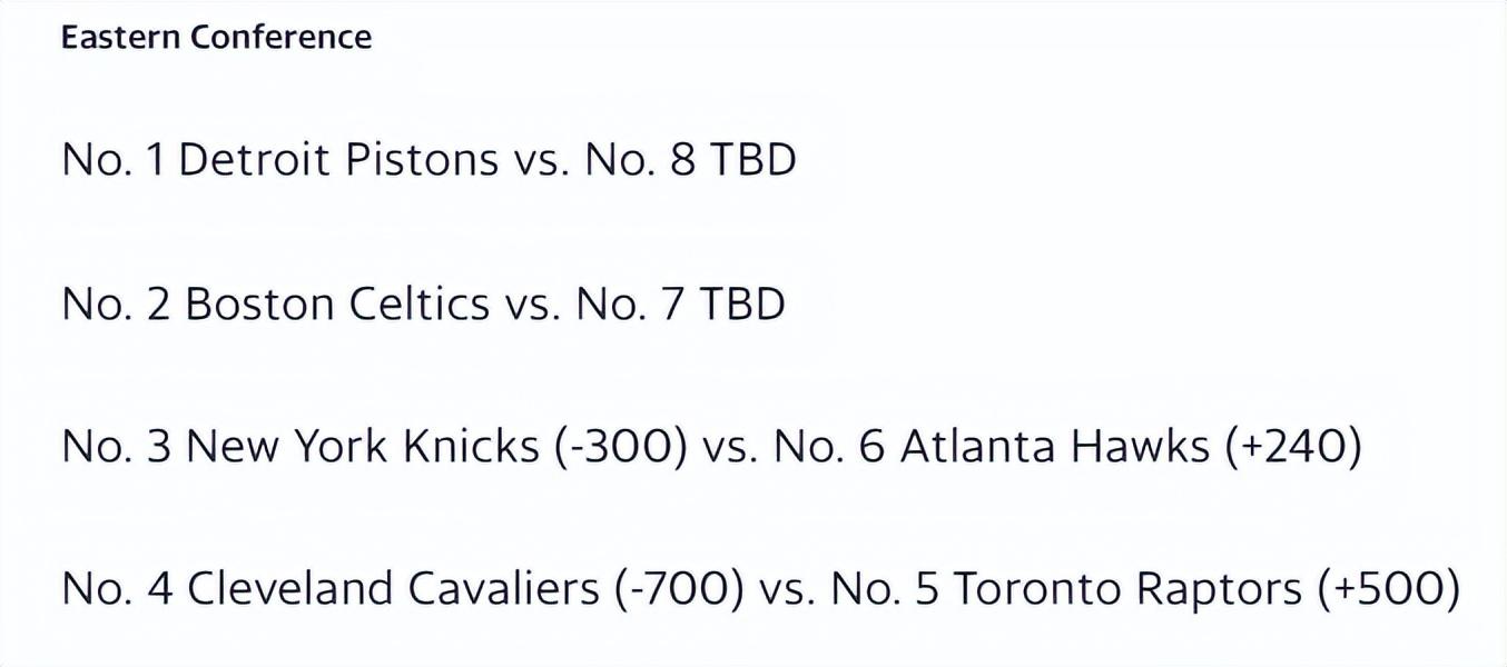 在常規賽徹底結束後《雅虎體育》出爐了季後賽首輪的賠率情況,東部:尼克斯(3)VS老鷹(6),尼克斯-300、老鷹+240看好尼克斯晉級;