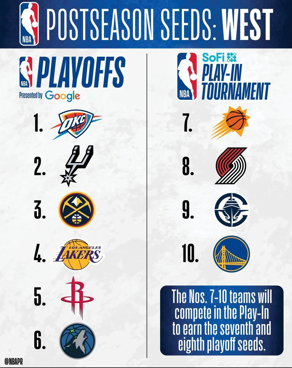 東部進入附加賽/季後賽的完整排名:雷霆64勝、馬刺62勝、掘金54勝、湖人53勝、火箭52勝、森林狼49勝、太陽45勝、開拓者42勝、快船42勝、勇士37勝。