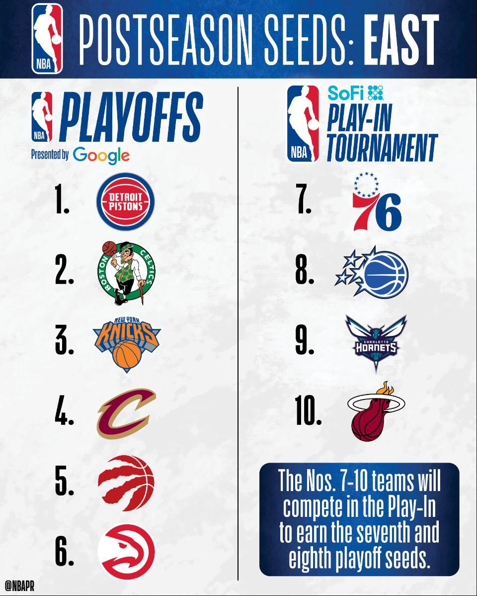 東部進入季後賽/附加賽的完整排名:活塞60勝、綠凱56勝、尼克斯53勝、騎士52勝、猛龍46勝、老鷹46勝、費城45勝、魔術45勝、黃蜂44勝、熱火43勝。