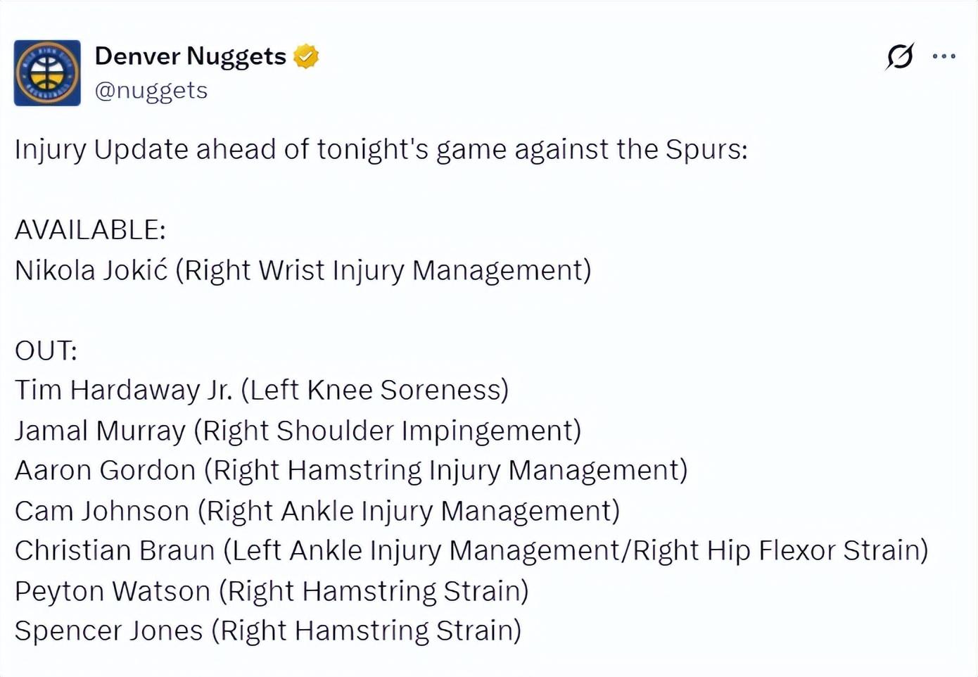 此役掘金輪休多位核心:布勞恩、戈登、卡約、穆雷、斯潘塞-瓊斯,約基奇單核帶隊。