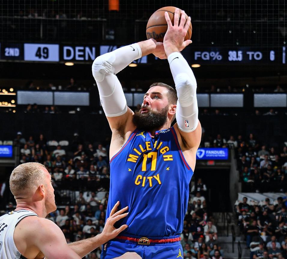次節約基奇休息了6分鐘才登場,他一上來就打開了進攻模式,外線三分命中,中距離命中,籃下勾手,單節6中5+三分1中1拿到11分1籃板1助攻,半場約基奇已經 拿到23分8籃板2助攻1蓋帽,替補的柯蒂斯-瓊斯單節三個三分球,半場打完掘金已經三人上雙。馬刺這邊半場打完兩人上雙,就連麥克勞林、比永博都登場了,半場打完掘金70-56領先馬刺。