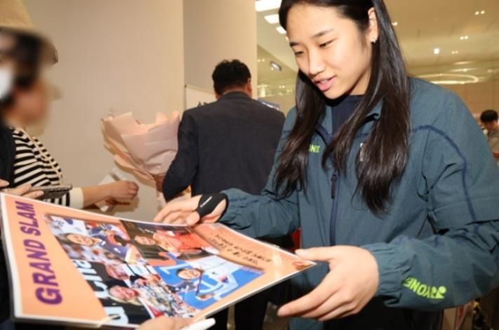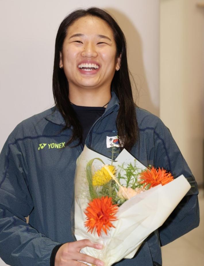 4月13日安洗瑩跟隨韓羽全體人員一同落地韓國仁川機場,拿到了全滿貫的安洗瑩載譽而歸非常開心,安洗瑩的臉都笑到皺皮了,還有球迷向安洗瑩獻上了鮮花。安洗瑩在拿到亞錦賽冠軍後,她湊齊了:奧運會、世錦賽、總決賽、全英賽、亞運會、亞錦賽,她成爲羽壇歷史首位達成全滿貫的女羽選手,無愧她‘羽壇女帝’的頭銜。