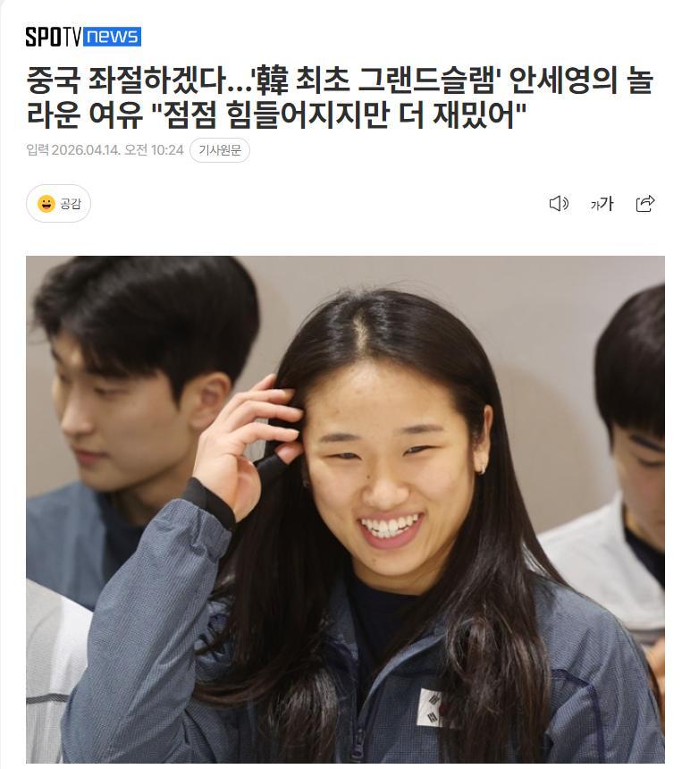 北京時間4月14日,韓國媒體《SPOTV NEWS》發佈專訪安洗瑩的稿件,在專訪中安洗瑩回應了在亞錦賽決賽後“霸氣比1”的用意,她說道:能夠實現一直以來作爲目標的事情,我兌現了自己的承諾,這個動作就是比喻拼上最後一塊拼圖,把缺失的東西都補齊了。