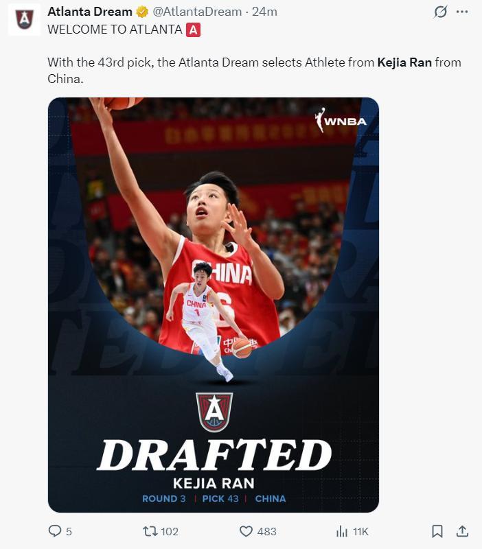 北京時間4月13日,WNBA選秀大會,亞特蘭大夢想隊在第三輪43順位選中了中國小將冉珂嘉。冉珂嘉身高1.81米,體重77公斤,她是四川達州人,目前效力四川女籃。