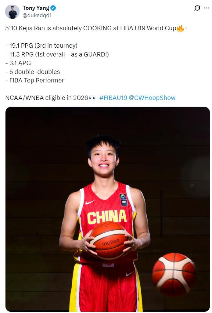2025年冉珂嘉還代表中國U19國青隊征戰世青賽,場均19.1分11.3籃板3.1助攻1.2搶斷,拿到五次兩雙,她也成爲了U19國青女籃的得分王+籃板王,身高只有1.81米的冉珂嘉身體素質太出色了。