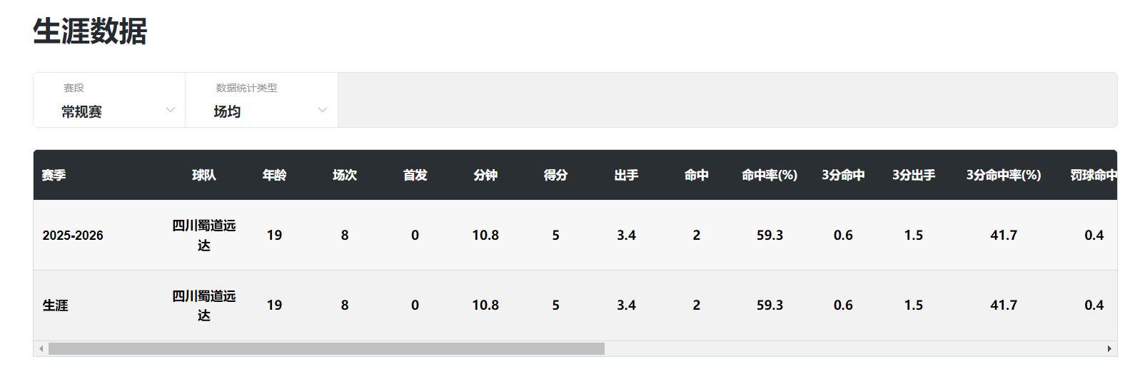 冉珂嘉今年才進入四川女籃一隊,常規賽僅僅出戰八場,場均10.8分鐘,拿到5分1.6籃板1.3助攻0.4搶斷0.1蓋帽,命中率59.3%,三分命中率41.7%。她是在全錦賽後才從二隊上調一隊。