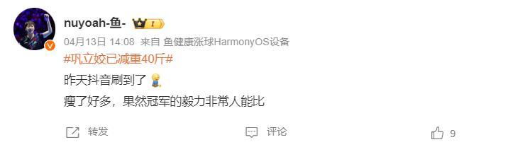 有網友表示:昨天就看到了鞏立姣瘦了好多,果然冠軍的毅力非比尋常。