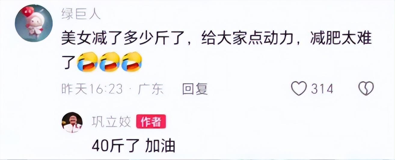 有網友詢問鞏立姣減肥多少斤了?減肥太難了!鞏立姣回應:40斤,加油。