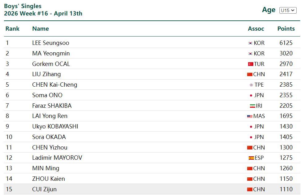 國乒U15男單世界前十五中有5人,崔梓俊恰好排在第十五位,名聲最大的就是劉子航,他這位15歲的天才選手甚至已經可以跨級打U19,不過在本站賴泓睿纔是冠軍。