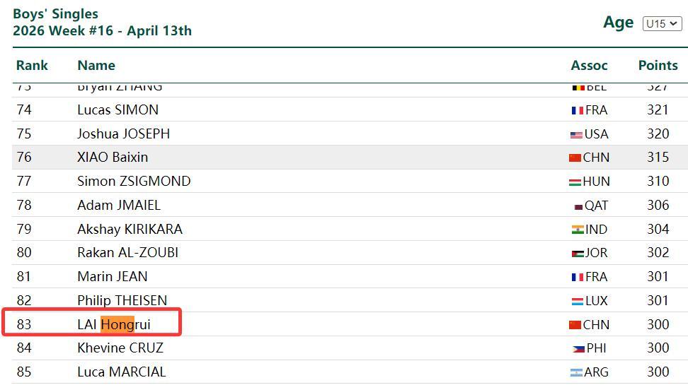 賴泓睿在U15男單的世界排名僅僅83位,而他決賽的對手崔梓俊世界排名爲15位,所以這場決賽必然算是爆冷。
