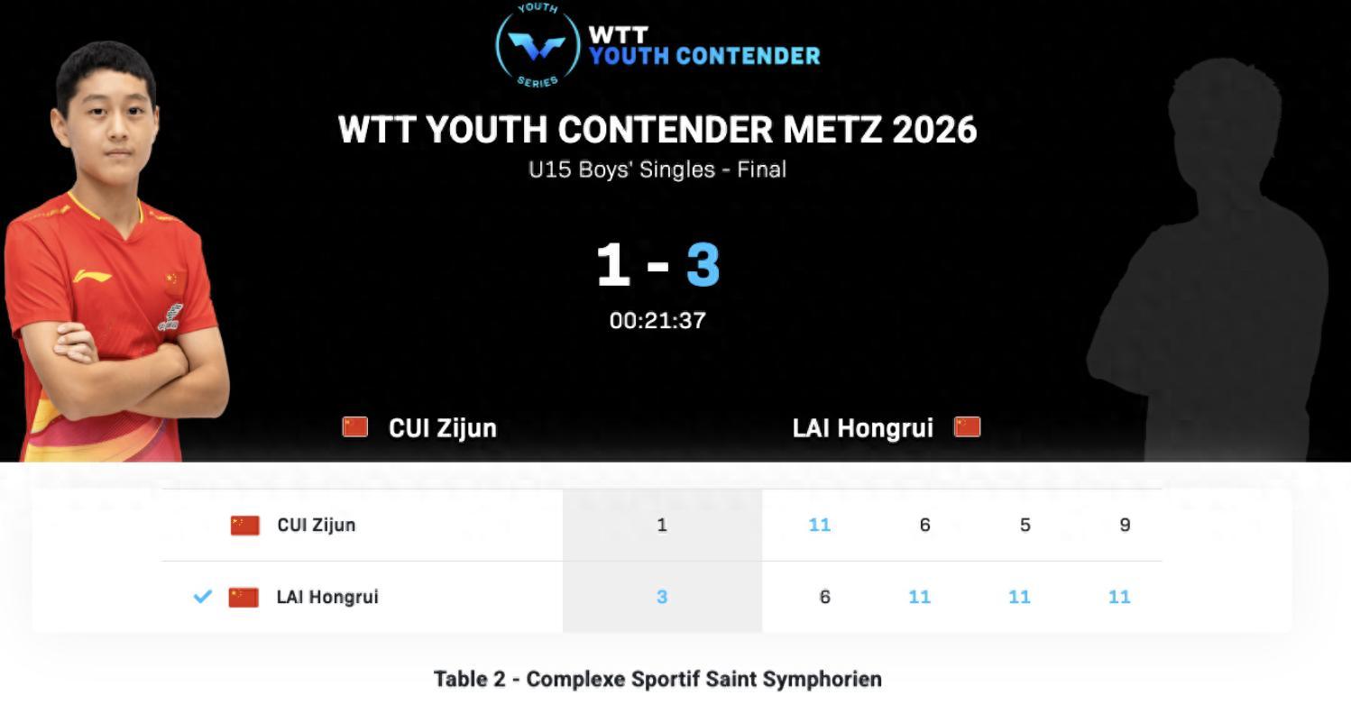 北京時間4月17日凌晨,WTT青少年常規挑戰賽梅斯站丨U15男單決賽,賴泓睿3-1崔梓俊奪冠,四局比分:【6-11,11-6,11-5,11-9】。這場比賽15歲的賴泓睿贏得較爲輕鬆,這位來自廣東的小將天賦已經溢出。