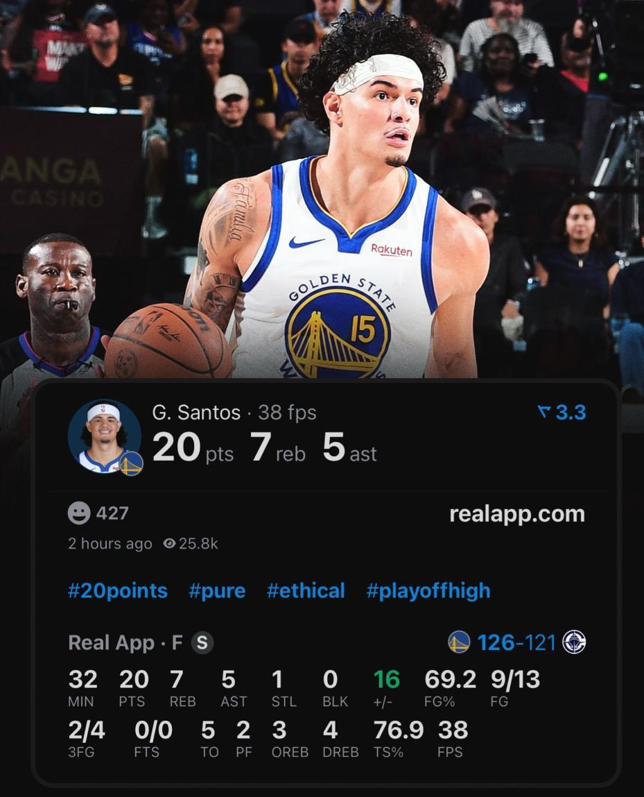 桑托斯全場比賽32分鐘,13中9,三分4中2,拿到20分7籃板5助攻1搶斷,命中率69.2%,三分命中率50%,真實命中率76.9%,正負值+16勇士全隊第一。