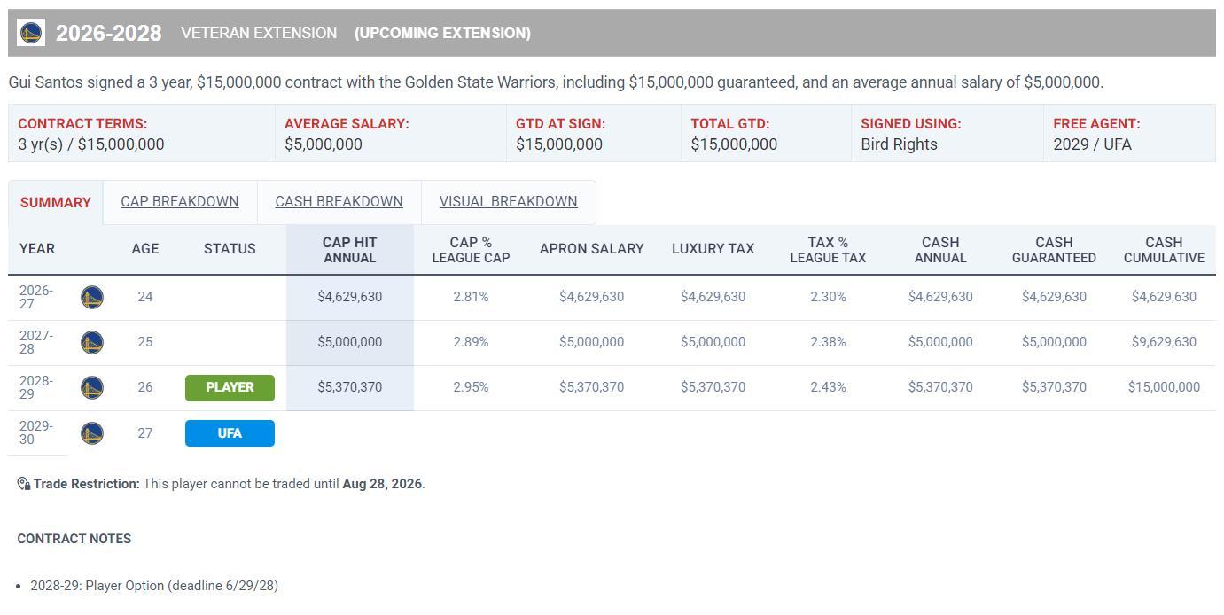 早些時候勇士與桑托斯提前續約三年1500萬,下賽季桑托斯的薪水上浮到462萬,28-29賽季是桑托斯的球員選項,桑托斯才23歲勇士這份續約合同贏麻了。