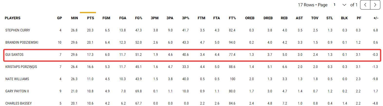 本賽季桑托斯爲勇士出戰了68場比賽其中30場先發,常規賽最後的7場比賽場均29.6分鐘,拿到17.3分5籃板3助攻1.3搶斷,命中率51.2%,三分命中率40.6%,他已經成爲勇士隊的第三巨頭。
