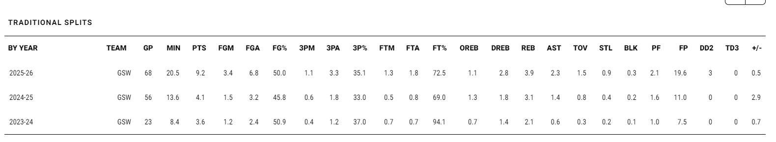 桑托斯是在2022年次輪55順位被勇士選中的球員,但勇士只跟他簽下了一份雙向合同,他在G聯賽打滿了整個賽季,23-24賽季他也只爲勇士打了23場比賽,而在G聯賽打了17場比賽。