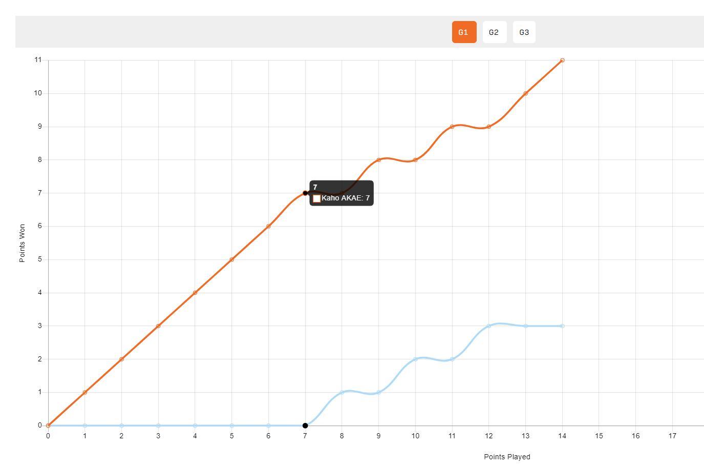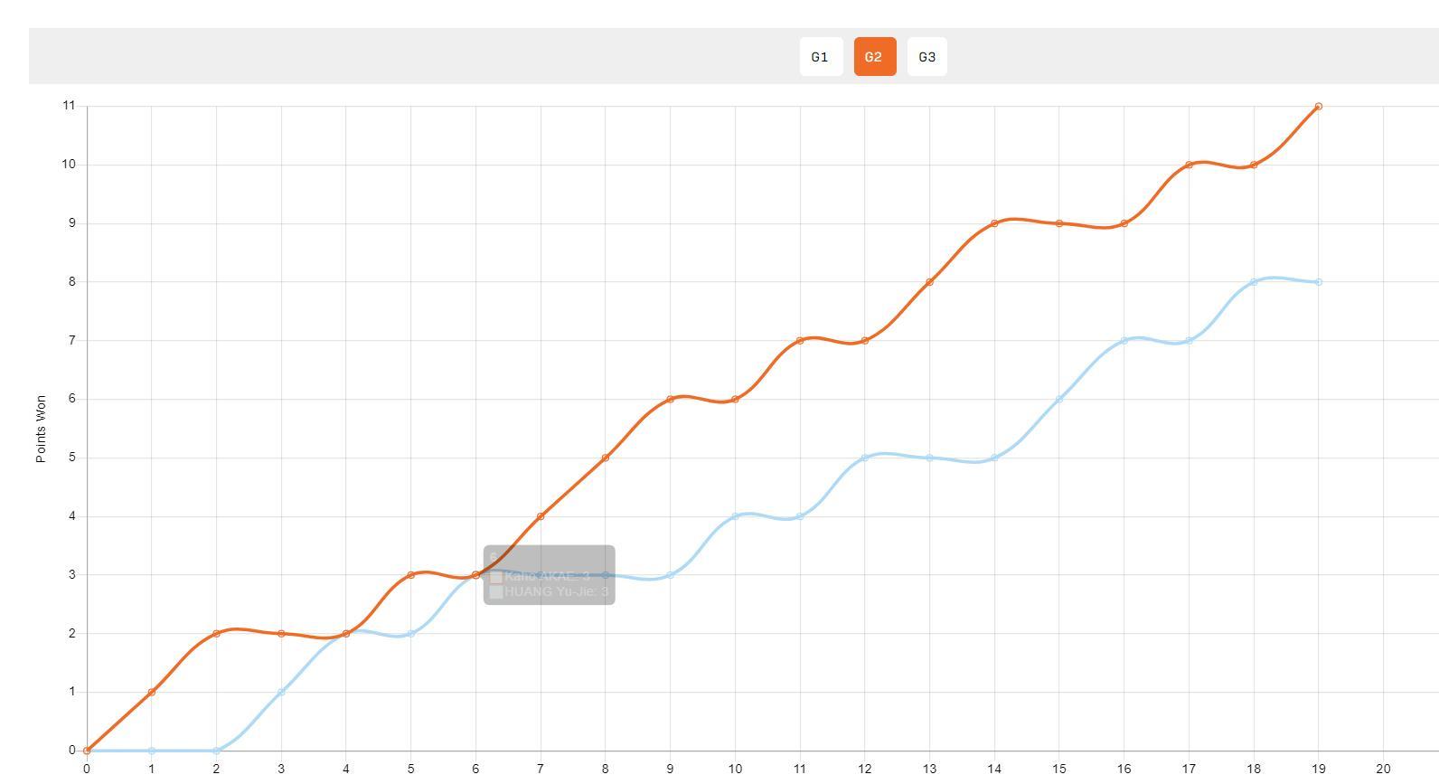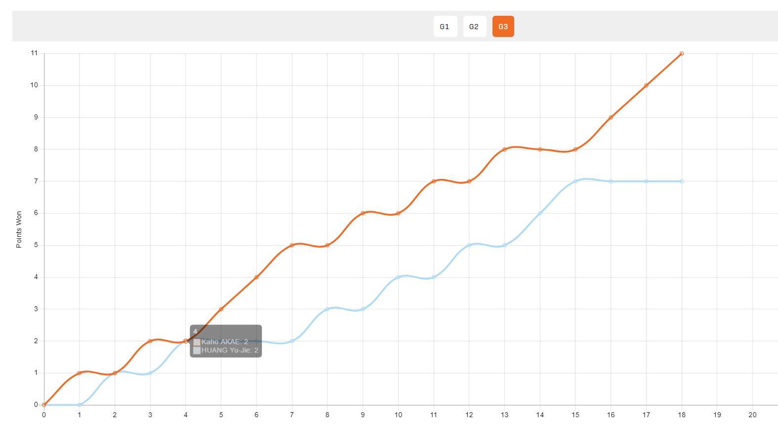 第二局開場兩人3-3,赤江夏星立馬打出3-0的攻勢6-3反超,隨後黃愉偼一直都處於落後捱打的局面,她一度追到7-9,關鍵分失誤後7-10,最終赤江夏星11-7拿下勝利。