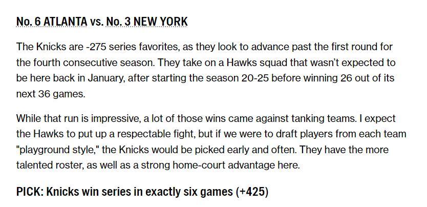 老鷹VS尼克斯的首輪,美媒預測尼克斯4-2淘汰老鷹晉級。老鷹本賽季重新確立了杰倫-約翰遜的領袖地位,新援亞歷山大-沃克成爲第二點,他們還是在實驗陣容之中,而尼克斯的四巨頭的化學反應已經很好,在尼克斯有主場優勢的情況下晉級沒有太大問題。