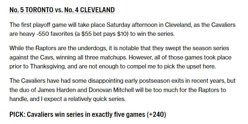 猛龍VS騎士的首輪,美媒是預測騎士4-1淘汰猛龍晉級次輪,雖然常規賽猛龍是三殺騎士隊,可季後賽不是常規賽,當哈登、米切爾、莫布利、阿倫四巨頭都健康時騎士隊的攻防都是壓制猛龍的存在。