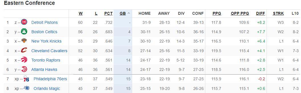 東部季後賽首輪:活塞VS魔術、凱爾特人VS76人、尼克斯VS老鷹、騎士VS猛龍。隨後美國媒體FOX體育對東部季後賽首輪的晉級形勢進行了預測。