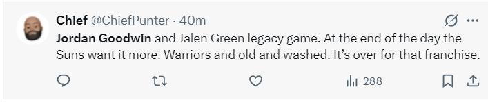 太陽媒體:古德溫與杰倫格林對於這場比賽意義非凡,太陽渴望勝利,很明顯勇士已經老去,他們的時代已經結束了。