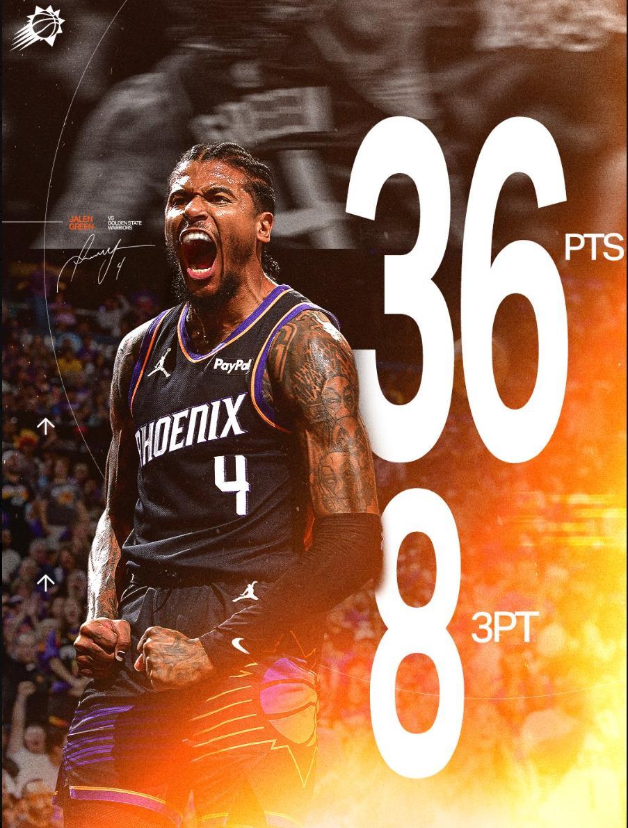 這場比賽太陽的贏球第一功臣可能是風雪哥杰倫-格林,他全場比賽40分鐘,20中14,三分14中8,拿到36分6籃板4助攻1搶斷3蓋帽,命中率70%,三分命中率57.1%,他打出了太陽生涯最高光的一場比賽。不過此役贏球的第二功臣是古德溫。