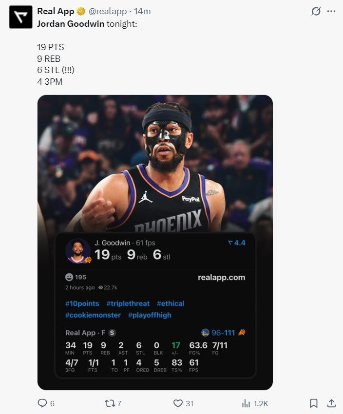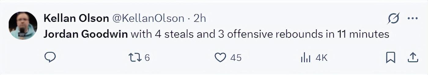 太陽記者:老實說我支持古德溫已經好幾年了,他拿到19+9+6搶斷非常出色,在同體型的球員中他是聯盟最出色的籃板手之一,本賽季他的搶斷次數聯盟前五。