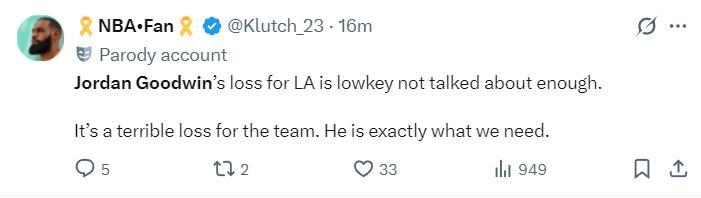 湖人媒體:古德溫的離開對於LAL來說很慘烈,他的離隊不該沒人提及,他對於我們來說是巨大的損失,我們很需要他這樣的球員。(2025年7月湖人爲了簽下斯馬特裁掉了古德溫,隨後太陽認領了古德溫)