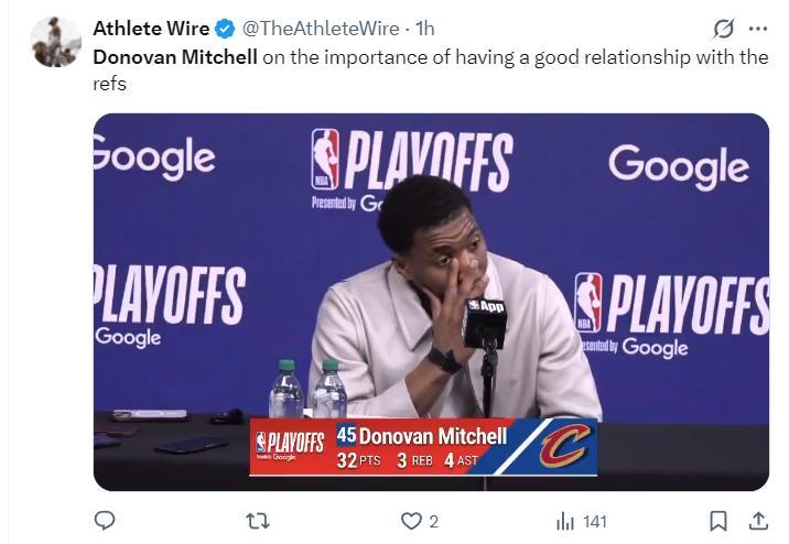 這場比賽的賽後米切爾將功勞都給了隊友們,他還盛讚了哈登對球隊的串聯作用,而且哈登個人得分能力也很強;他也提到在替補席拿到24分的斯特魯斯,整個賽季斯特魯斯都是球隊的重要得分手,他的三分球能力值得信賴。米切爾甚至還表示不要在比賽中跟裁判去爭論,專注打好自己的比賽。