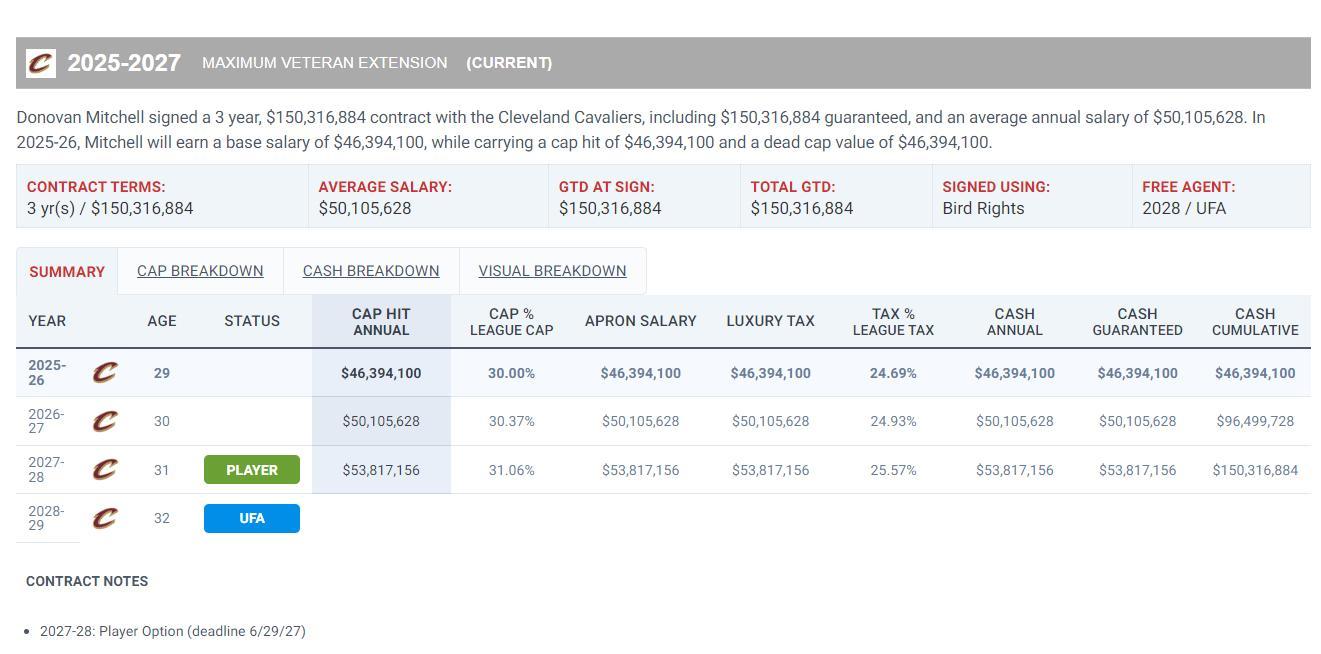 29歲的米切爾本賽季的常規賽場均33.5分鐘拿到27.9分4.5籃板5.7助攻1.5搶斷0.3蓋帽,命中率48.3%,三分命中率36.4%,他還剩兩年合同,但27-28賽季是球員選項。他今夏有資格跟騎士達成一份四年2.77億的超級頂薪提前續約,騎士會給他這份均薪高達6925萬的超級頂薪嗎?
