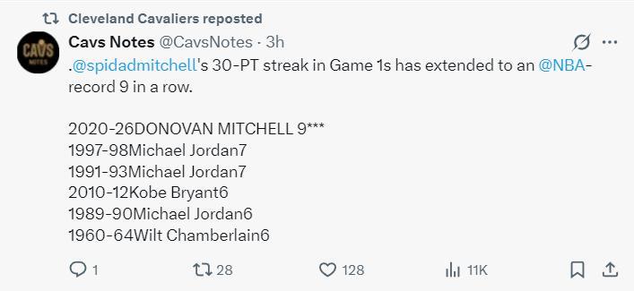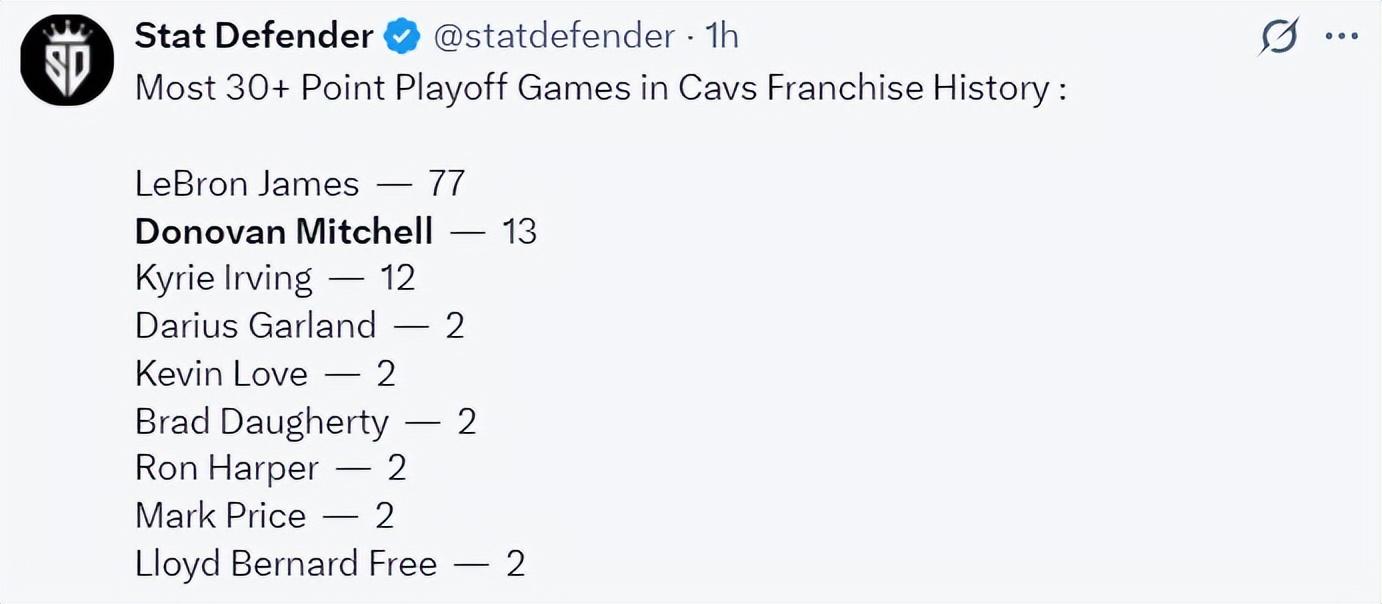 這場比賽後米切爾還創造多項紀錄:1.這是他季後賽生涯第32場30+;