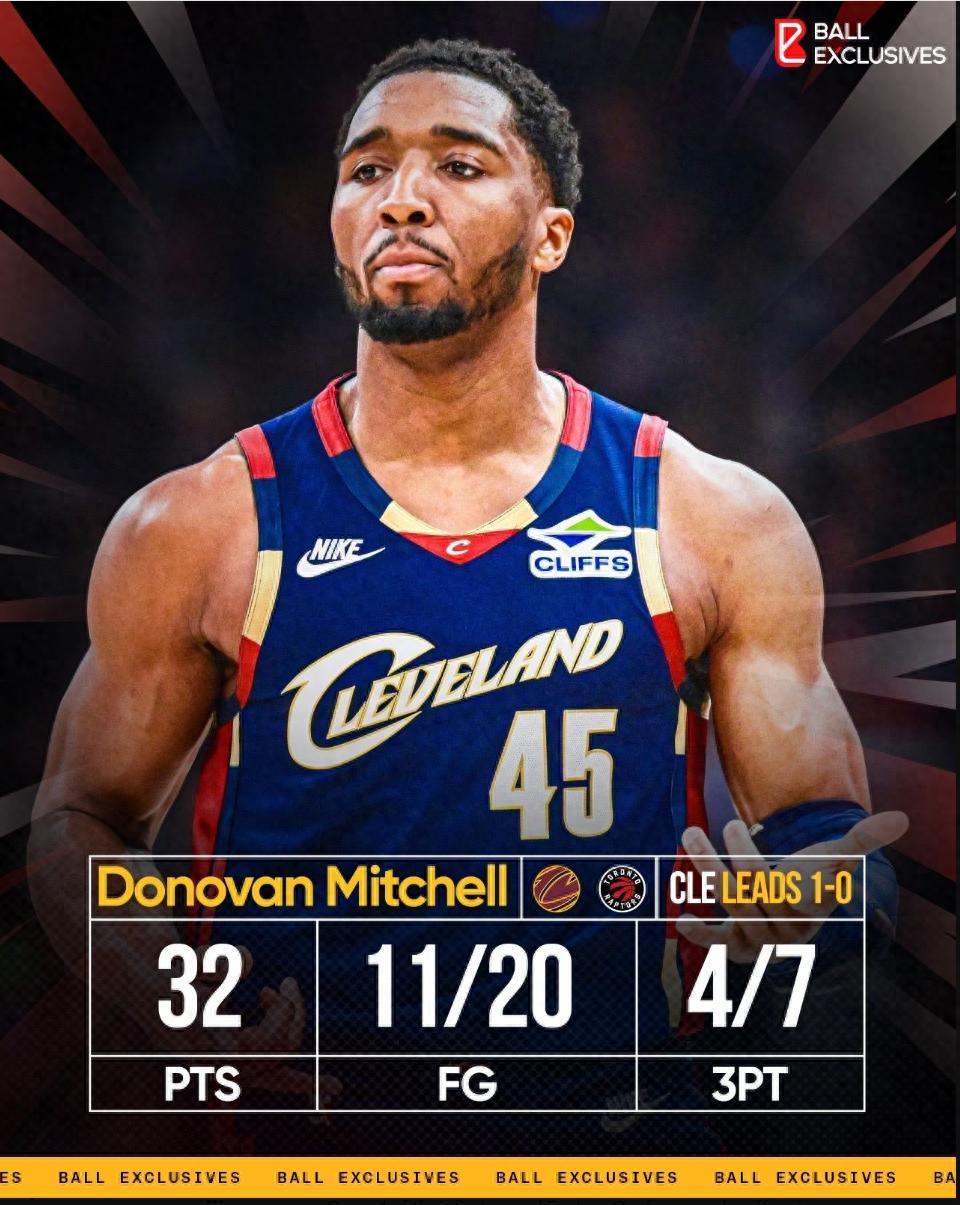 騎士大勝猛龍拿到季後賽首輪G1的勝利,多諾萬-米切爾在這場比賽中僅僅登場30分鐘,20中11,三分7中4,罰球7中6,拿到32分4助攻3籃板2搶斷4失誤,命中率55%,三分命中率57.1%,真實命中率69.3%,正負值+16。