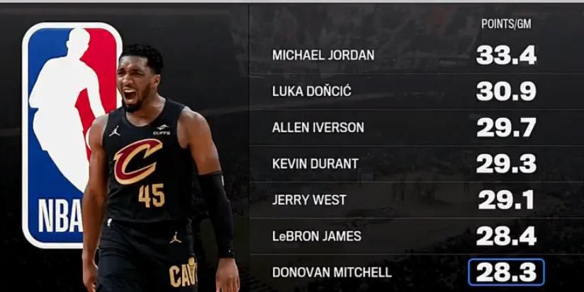 6.NBA歷史季後賽場均得分排名米切爾28.3分第七,詹姆斯28.4分第六;