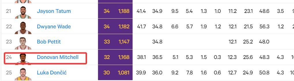 5.米切爾季後賽32次30+排在歷史第24位,東契奇30次第25位;