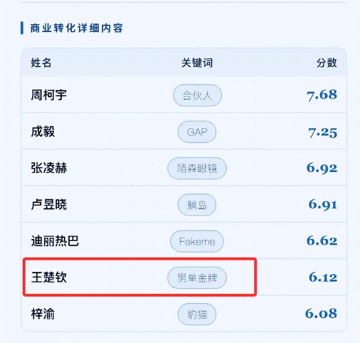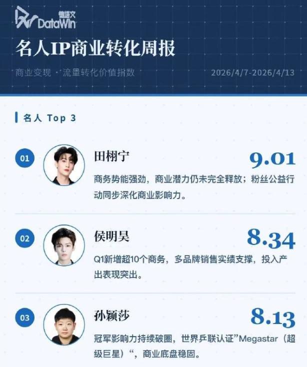 根據德塔文最新消息,2026年4月7日-13日的名人IP商業轉化週報中以 8.13分 位列第三,前兩名分別爲藝人田栩寧(9.01分)和侯明昊(8.34分)。