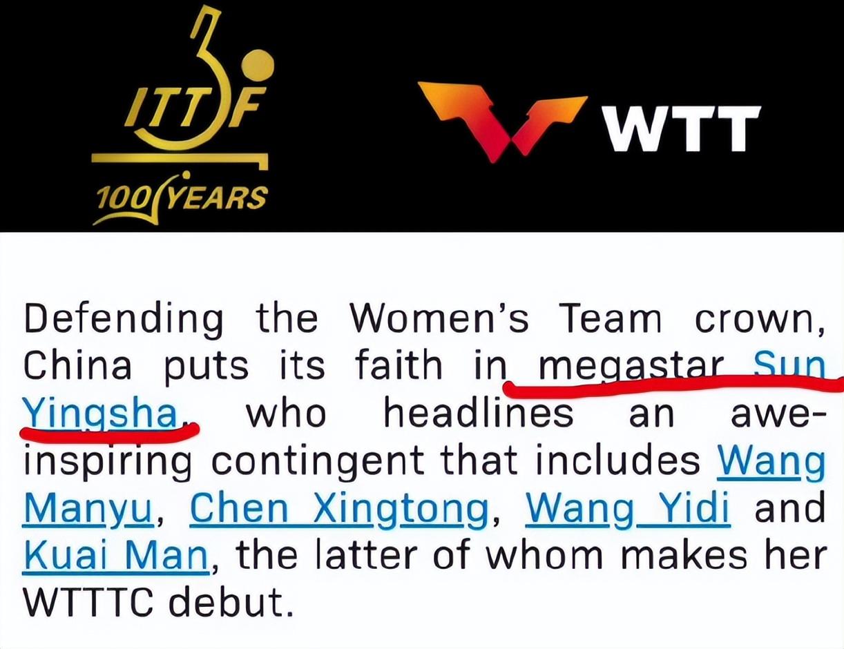 此前WTT在預熱倫敦世乒賽中寫道:中國女團衛冕冠軍中國隊派出超級豪華陣容,由超級巨星孫穎莎領銜,隊員還有王曼昱、陳幸同、王藝迪、蒯曼等超級強手。