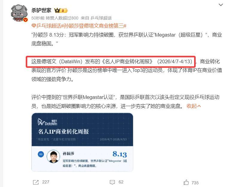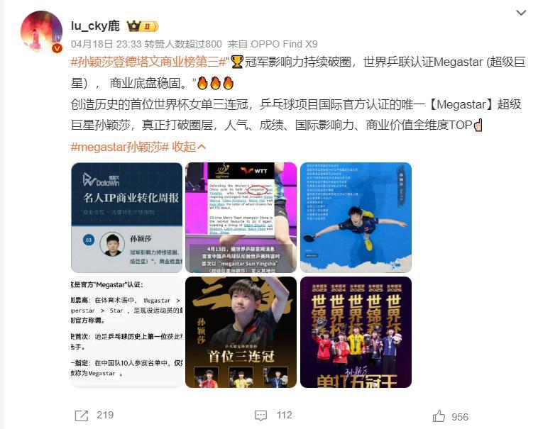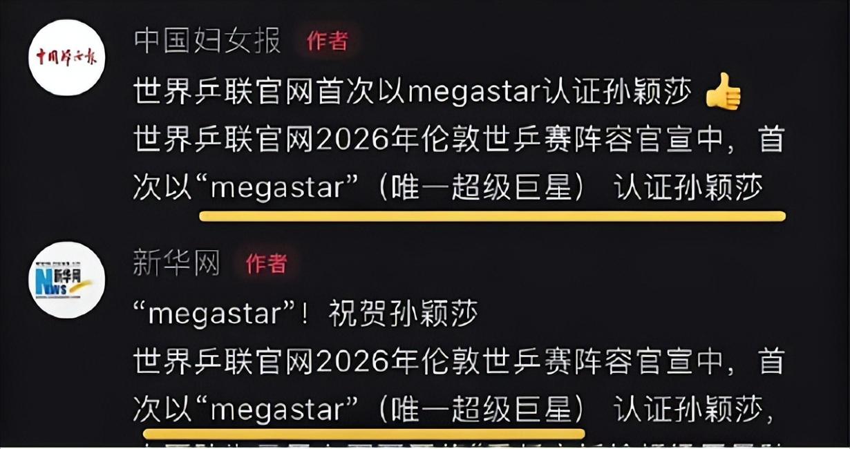 有博主寫道:德塔文評價中提到的‘世界乒聯Megastar認證’是國際乒聯首次以該頭銜定義現役運動員,也是她近期破圈影響力的核心來源。