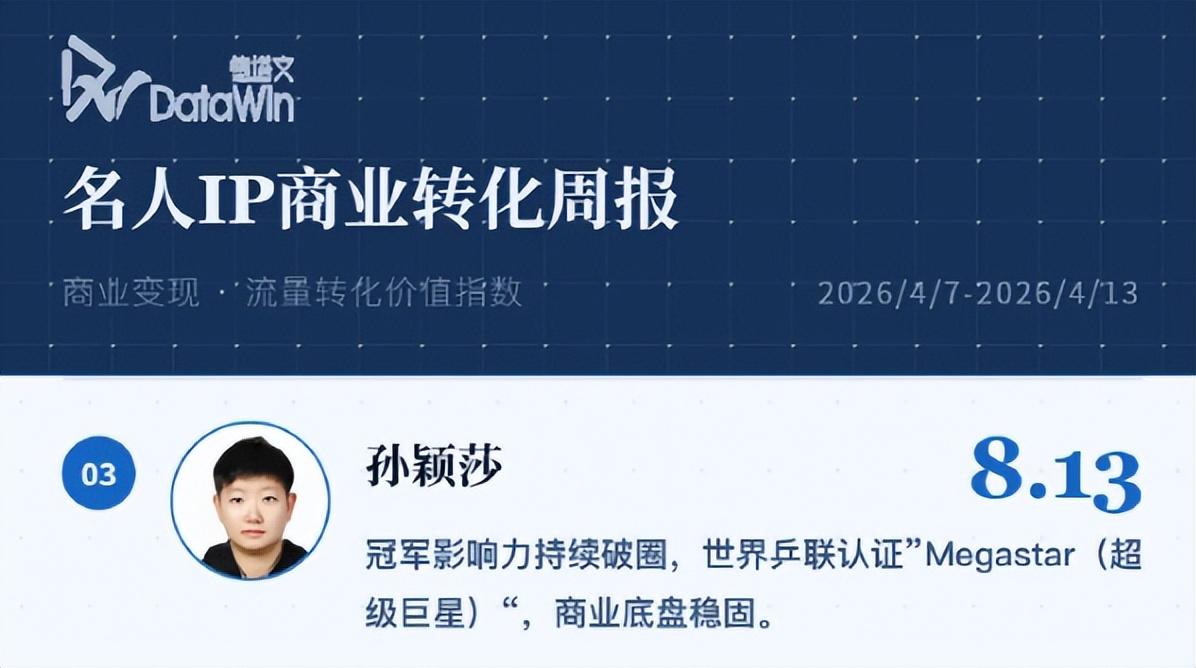 孫穎莎是名人Top 3中唯一的體育明星,而德塔文給孫穎莎的介紹“冠軍影響力持續破圈,世界乒聯認證Megastaer(超級巨星),商業底盤穩固。”
