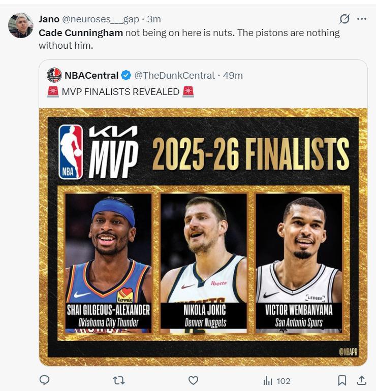 這場比賽之前NBA官方公佈了本賽季的MVP候選人名單:亞歷山大、約基奇、文班亞馬。有活塞球迷爲CC抱不平:很奇怪沒有坎寧安,因爲活塞如果沒有坎寧安的話什麼也不是。