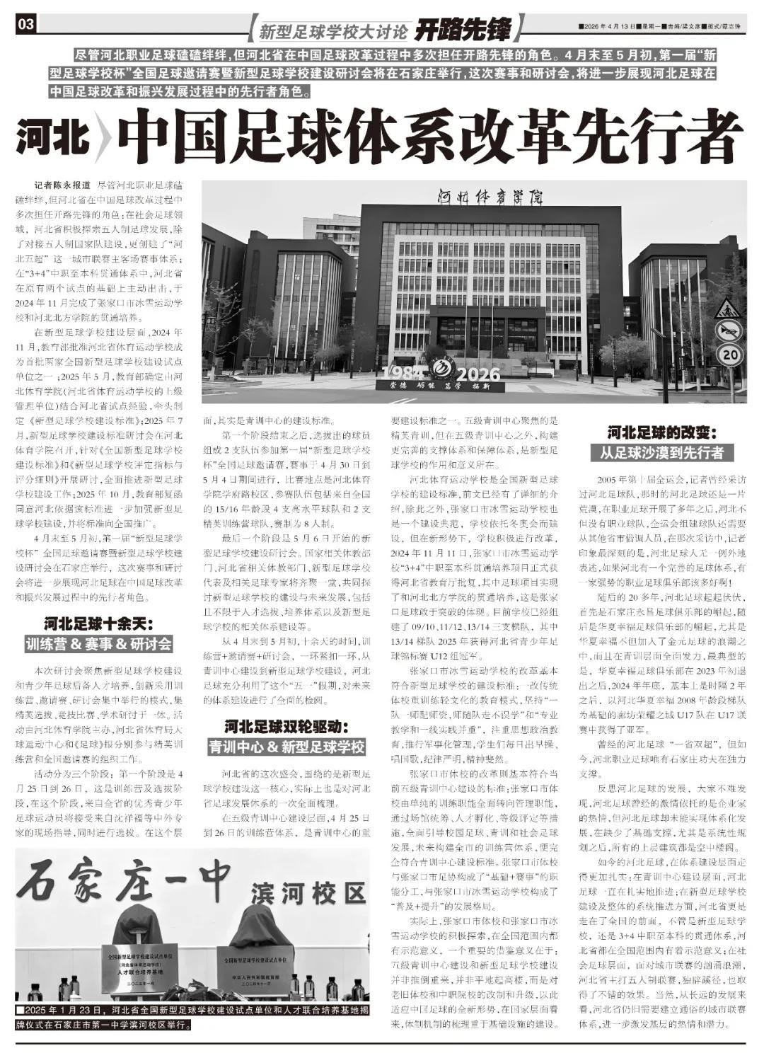 在新型足球學校建設層面,2024年11月,教育部批准河北省體育運動學校成爲首批兩家全國新型足球學校建設試點單位之一 ;2025年5月,教育部確定由河北體育學院(河北省體育運動學校的上級管理單位)結合河北省試點經驗,牽頭制定《新型足球學校建設標準》;2025年7月,新型足球學校建設標準研討會在河北體育學院召開,針對《全國新型足球學校建設標準》和《新型足球學校評定指標與評分細則》開展研討,全面推進新型足球學校建設工作;2025年10月,教育部覆函同意河北依據該標準進一步加強新型足球學校建設,並將標準向全國推廣。