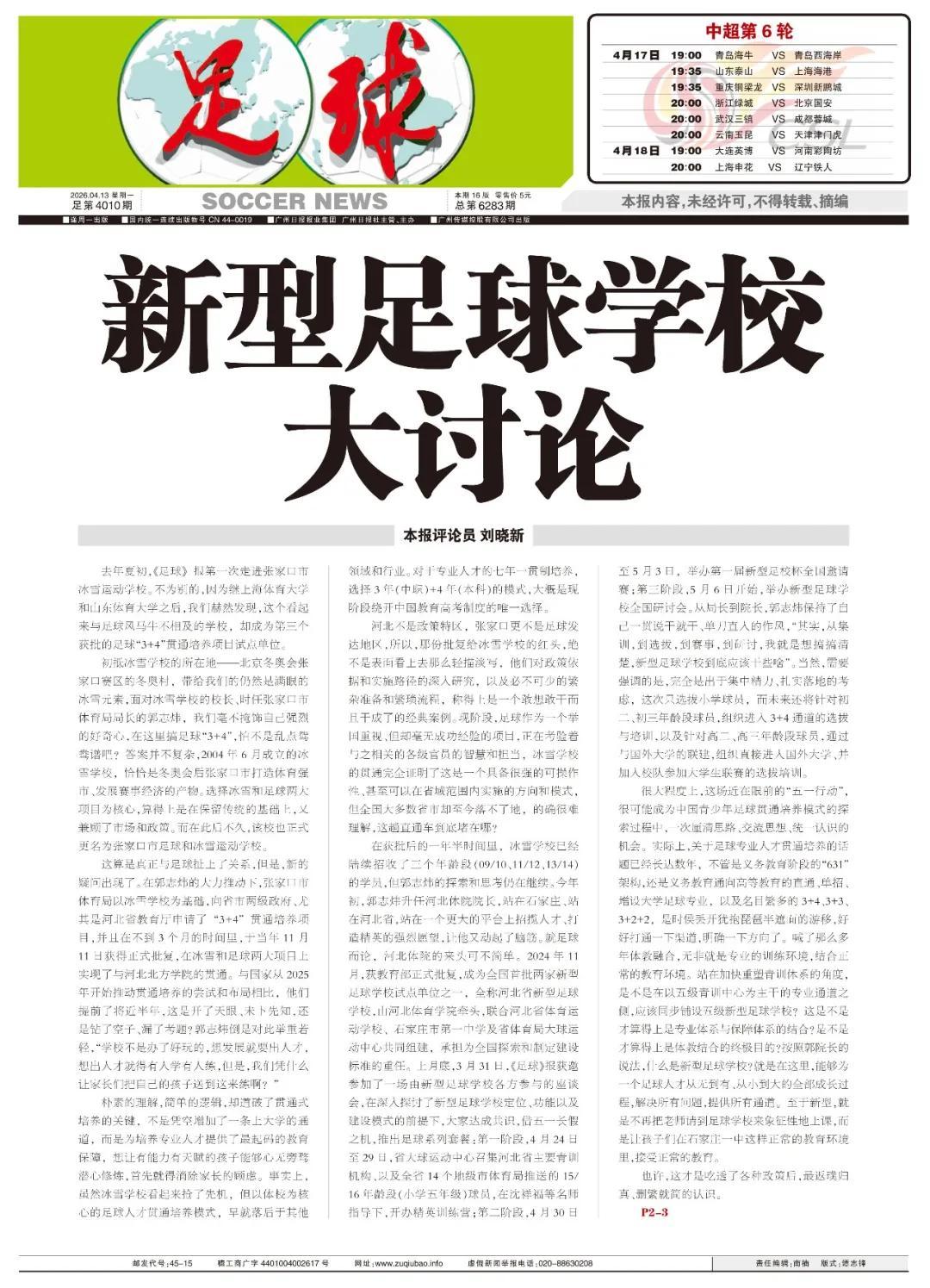 上月底,3月31日,《足球》報獲邀參加了一場由新型足球學校各方參與的座談會,在深入探討了新型足球學校定位、功能以及建設模式的前提下,大家達成共識,借五一長假之機,推出足球系列套餐:第一階段,4月24日至29日,省大球運動中心召集河北省主要青訓機構、以及全省14個地級市體育局推送的15/16年齡段(小學五年級)球員,在沈祥福等名師指導下,開辦精英訓練營;第二階段,4月30日至5月3日,舉辦第一屆新型足校杯全國邀請賽;第三階段,5月6日開始,舉辦新型足球學校全國研討會。