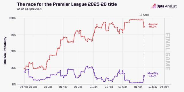 根據對對手實力進行評估,Opta算出曼城剩餘的7個對手(阿森納、伯恩利、埃弗頓、布倫特福德、伯恩茅斯、水晶宮和維拉)平均評分爲92.0,而阿森納的對手(曼城、紐卡斯爾、富勒姆、西漢姆、伯恩利、水晶宮)則爲90.4。換言之,曼城的對手更強,剩餘賽程的難度也要更高一些。