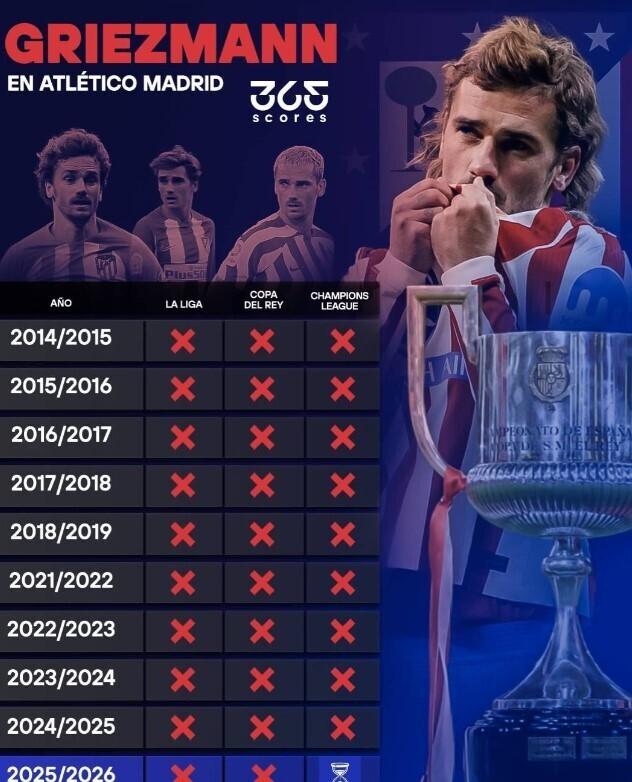 這位法國球星以211粒進球成爲馬競隊史最佳射手,超越了打進173球的傳奇阿拉貢內斯;他還代表紅白軍團出場488次,位列隊史出場榜第四。在十個賽季裏,格列茲曼爲馬競贏得過三座冠軍獎盃——2014年的西班牙超級盃,以及2018年的歐聯杯和歐洲超級盃。然而,在長達17年的西甲生涯中,格列茲曼始終未能觸碰期盼已久的聯賽冠軍和歐冠獎盃。
