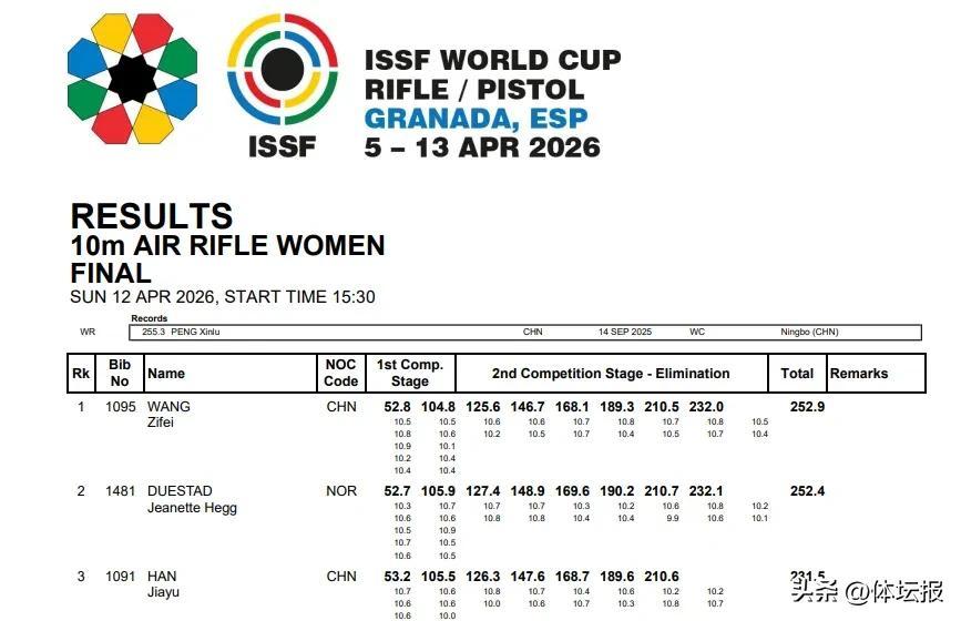 北京時間4月12日晚,2026年國際射聯射擊世界盃西班牙格拉納達站進行了最後一個項目女子10米氣步槍決賽,浙江選手王子菲以252.9環奪冠,另一名浙江選手韓佳予獲得銅牌。