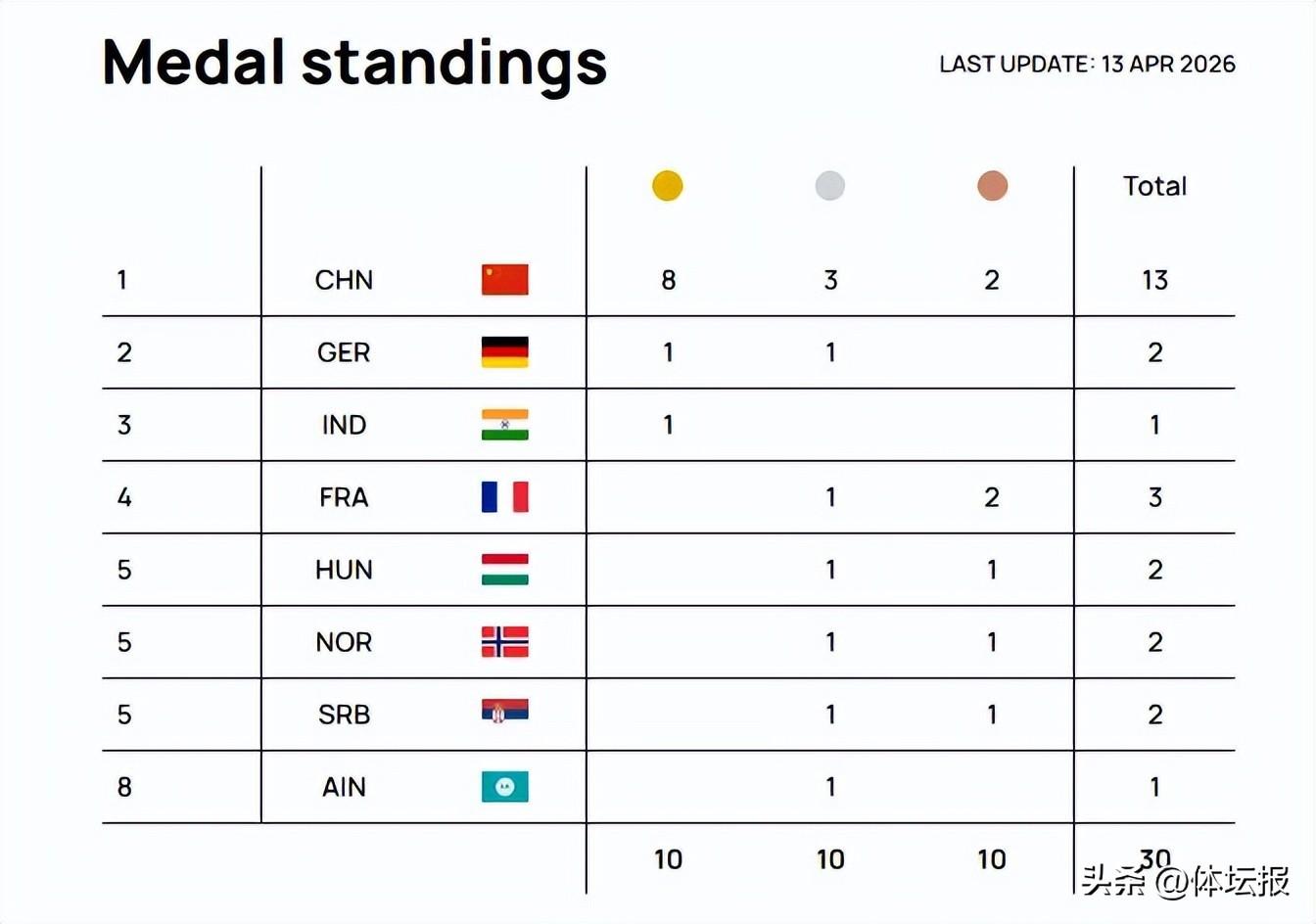 至此,爲期6天的格拉納達站全部結束。中國隊最終奪得本站全部10枚金牌中的8枚,以8金3銀2銅共13枚獎牌位列獎牌榜頭名,創造了中國隊世界盃參賽歷史最好成績。