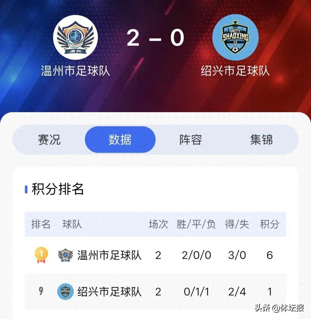 終場哨響,比分定格,2:0,溫州隊擊敗了遠道而來的紹興隊。積分榜上,溫州隊二連勝獨一份,積6分領跑吳越羣雄。