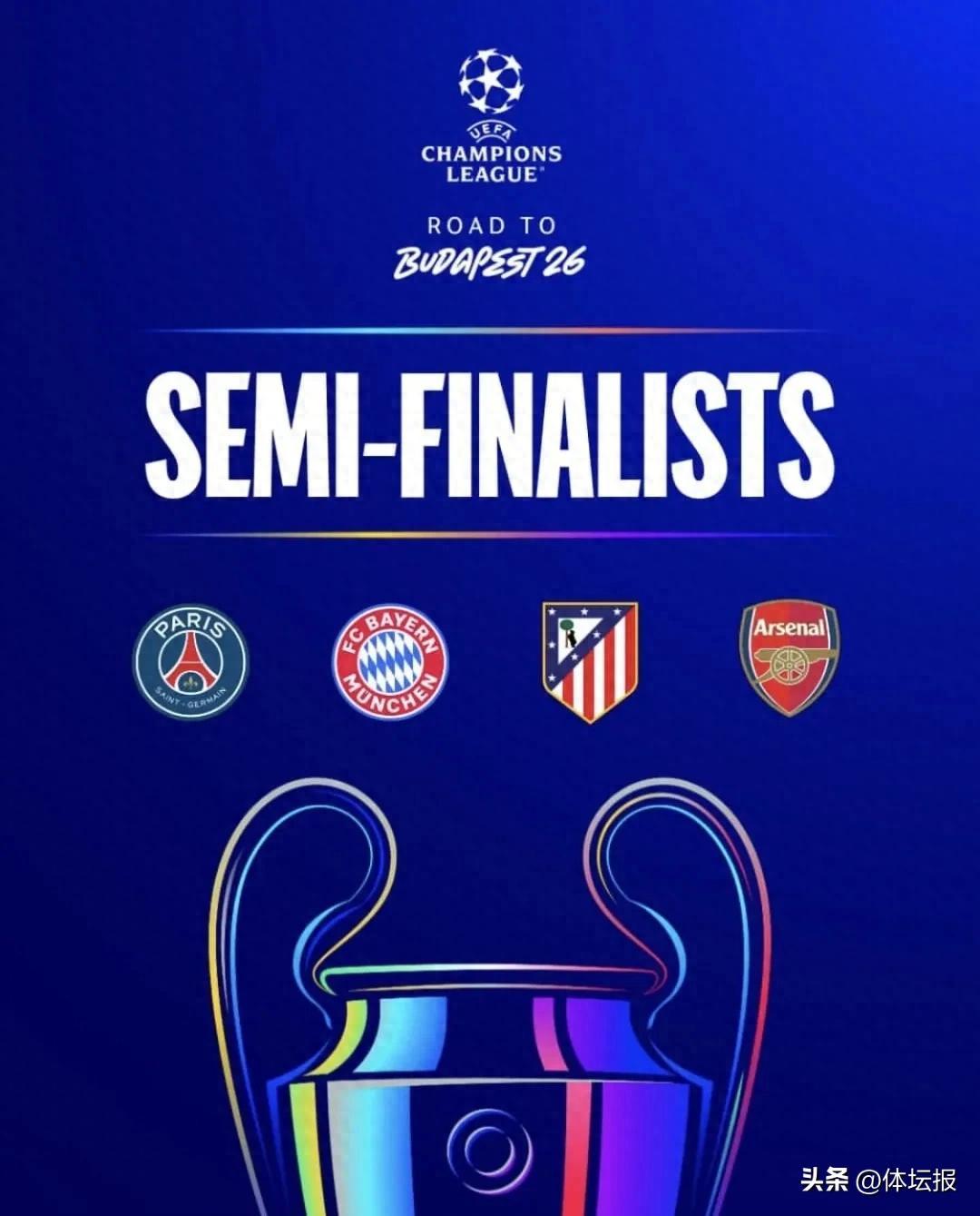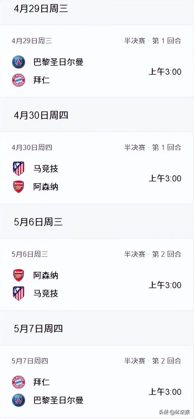 歐冠半決賽首回合預計在4月29日、30日舉行,次回合在5月6日、7日舉行,均爲北京時間3:00。