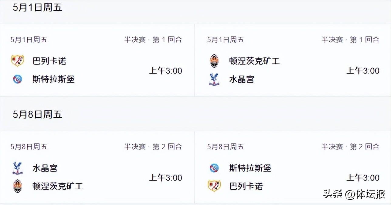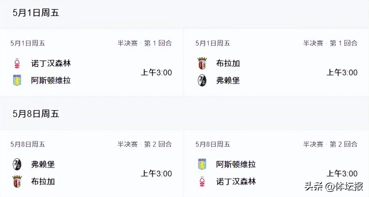歐協聯半決賽首回合預計在5月1日舉行,次回合在5月8日進行,均爲北京時間3:00。